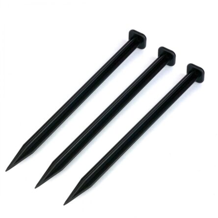 The anchor is a mounting element made from durable recycled plastic. It has the form of a rigid pin with a profiled compression head that ensures stable installation of edging and garden materials.