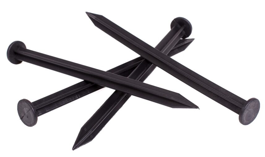- fastening landscape fabric, weed barrier fabric, fleece, and mulch mats,