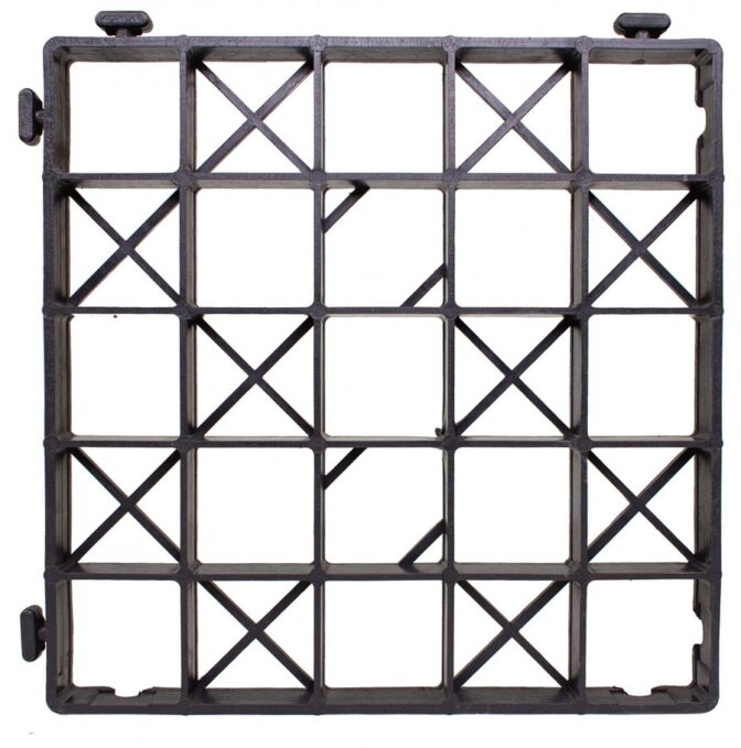 Modules measuring 33.5 cm x 33.5 cm connect via a system of side hooks and sockets, creating a unified structure resistant to shifting.