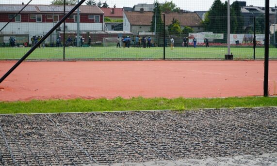 Łączenie paneli odbywa się na ścianach bocznych poprzez system zaczepów i wpustów, które zatrzaskują się w gniazdach sąsiednich modułów, zapewniając równe i stabilne zespolenie elementów w jednolitą nawierzchnię.